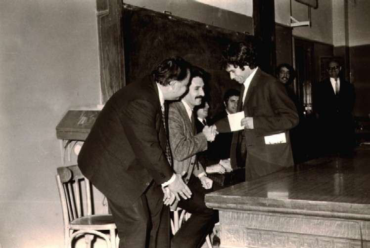 Αμφιθέατρο Φιλοσοφικής Αριστοτελείου, Μάϊος 1971. Βράβευση σε φοιτητικό ποιητικό διαγωνισμό. Κριτική επιτροπή: Γιώργος Σαββίδης, ο καθηγητής Σηφάκης, ο συγγραφέας Γιώργος Ιωάννου (μισοκρυμμένος), δυο φοιτητές και ο καθηγητής Χρύσανθος Χρήστου |