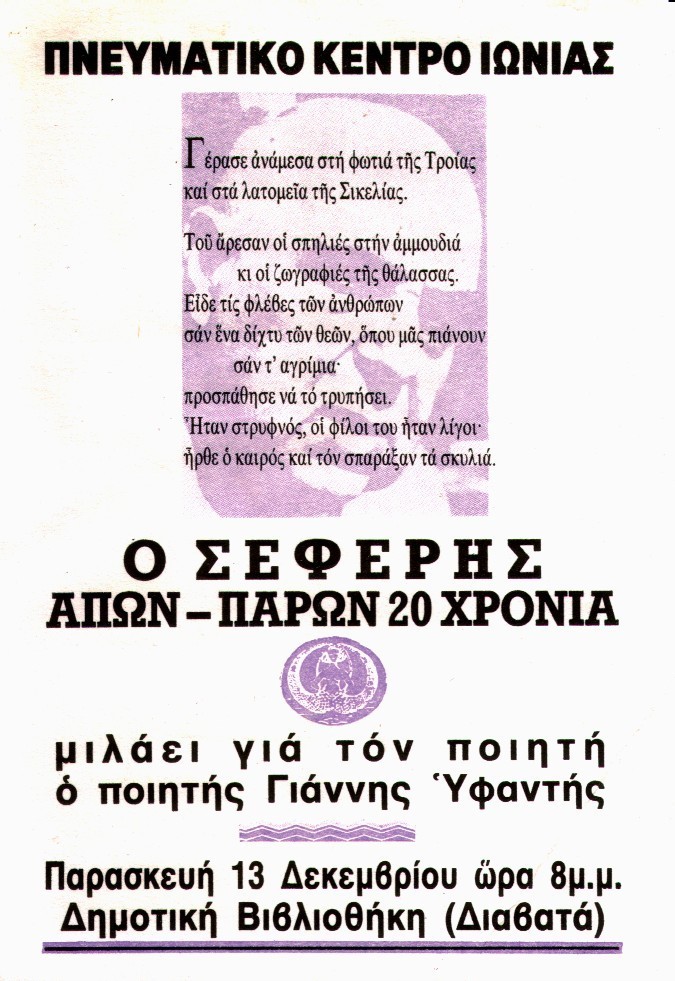 | Ομιλία για τον Σεφέρη στον Δήμο Ιωνίας, Θεσσαλονίκη 1991 |